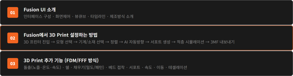 Fusion UI 소개부터 3D Print 워크스페이스 진입, 기계·소재 선택, 정렬·서포트 생성, 3MF 내보내기까지 전체 플로우를 한 권에 정리했습니다.
